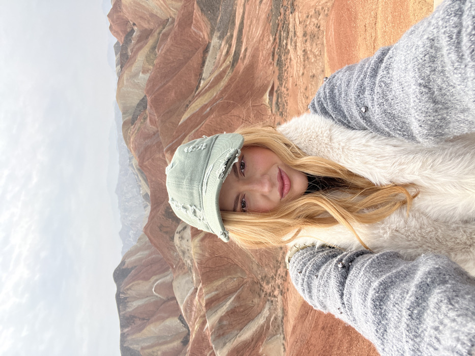A female subject is depicted in a close-up selfie portrait within the Zhangye Danxia National Geopark, Zhangye, China