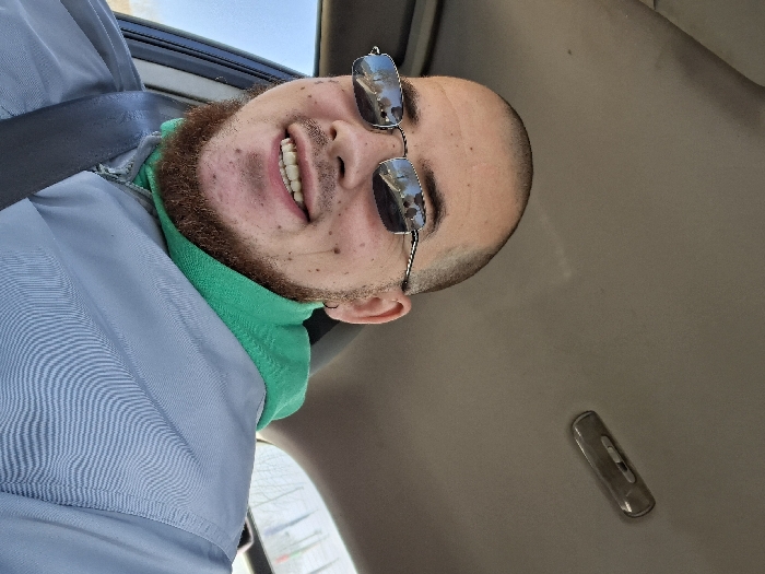 The image depicts a male individual inside a vehicle, identified as being in Velingrad, Bulgaria. The man, with a shaved head and a reddish-brown full beard, is smiling directly at the camera, showing his teeth. He is wearing dark, rectangular sunglasses with silver frames that reflect a blurry outdoor scene. A small, dark hoop earring is visible in his left earlobe. His complexion shows multiple small, dark spots or freckles on his cheeks. He is dressed in a grey collared shirt or jacket worn over a bright green hooded sweatshirt, with the green hood visible around his neck. A dark grey seatbelt is diagonally secured across his chest and left shoulder. The vehicle's light-colored headliner is visible above him, featuring a rectangular overhead dome light fixture towards the upper right. A window to the left of the man shows a blurred exterior background with hints of blue sky.
