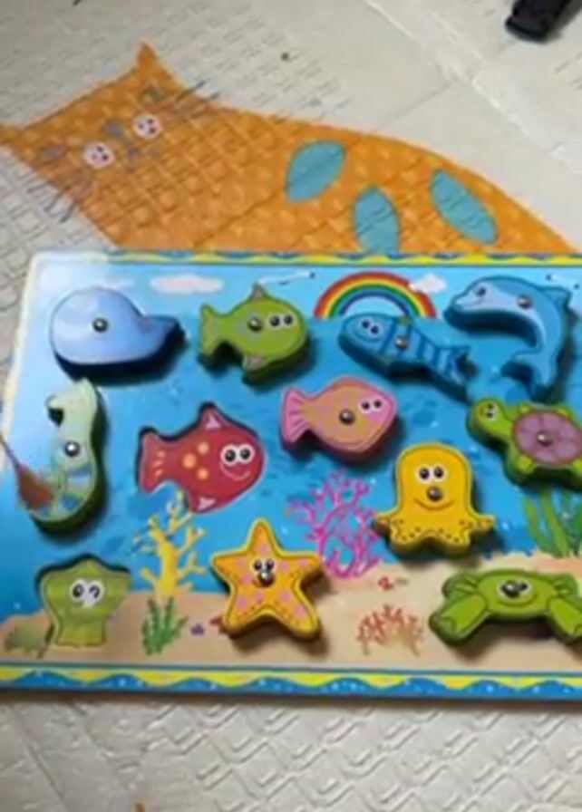 A close-up, eye-level shot shows a child playing with a magnetic fishing toy. The toy consists of a blue wooden board with cartoon sea animals, each piece being a separate, magnetic block that fits into its respective shape-cutout. The child uses a magnetic fishing rod to lift the seahorse-shaped piece. The background features a play mat patterned with an orange cartoon cat, and various other toys and objects are scattered around.