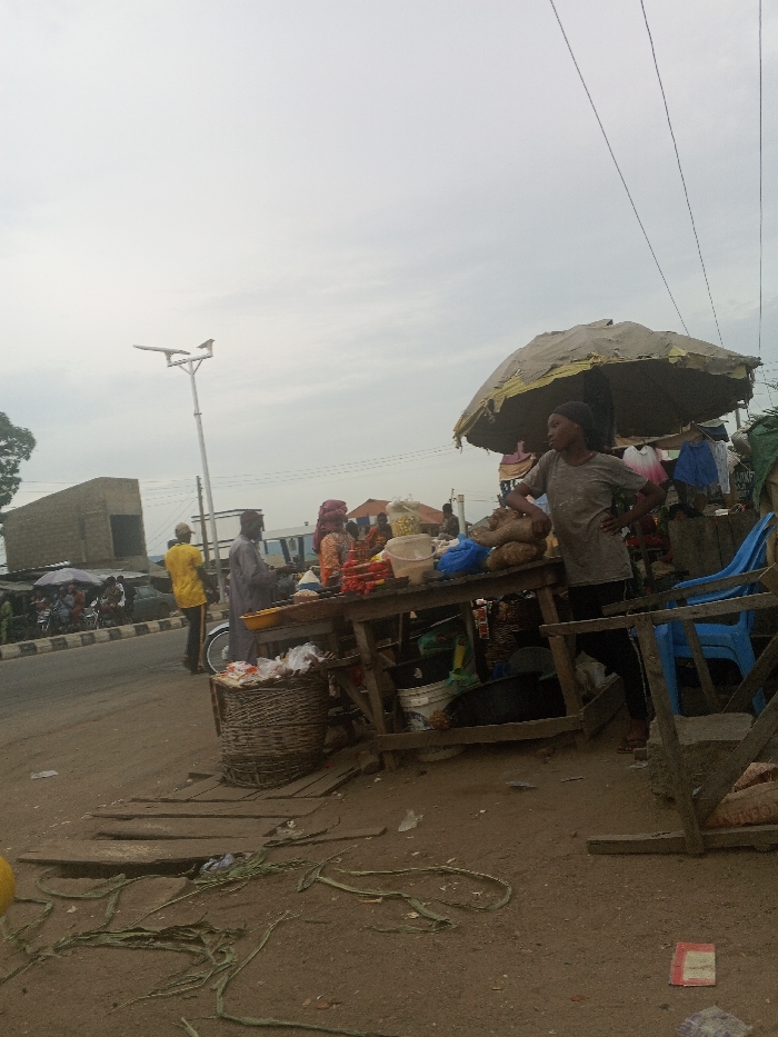 The image depicts a bustling roadside market scene in Zango-ndaji, Nigeria, under an overcast sky. In the foreground, a bare dirt ground is visible, strewn with dried plant material, scattered debris, and a small red paper item. Several wooden planks lie horizontally on the ground. Dominating the midground is a rudimentary market stall constructed from rough wooden planks, covered by a large, tattered beige umbrella. The stall displays various goods, including sacks of produce, items in plastic bags, plastic buckets, and what appear to be tubers or root vegetables. A person, dressed in a grey t-shirt and dark trousers, stands to the right of the stall with hands on hips, facing left. Behind the stall, other individuals are partially visible, one in an orange-patterned garment and another with a headscarf, engaged with the goods. A blue plastic chair is positioned to the far right of the stall. A large, woven basket sits on the dirt ground near the stall. In the background, a paved road runs horizontally. A black and white striped curb separates the dirt market area from the road. Several motorcycles are parked or in motion along the roadside, surrounded by groups of people. A person in a yellow shirt stands near the curb, facing away from the viewer. Another individual, wearing a light-colored robe, stands near a bicycle on the dirt path, facing towards the market stall. A tall, white street light pole with an integrated solar panel is prominently situated to the left of the road. Overhead power lines traverse the upper right quadrant of the frame. On the far left, a partially constructed building made of concrete blocks is visible, alongside some green foliage from a tree. Additional structures and shaded areas are present further in the background.
