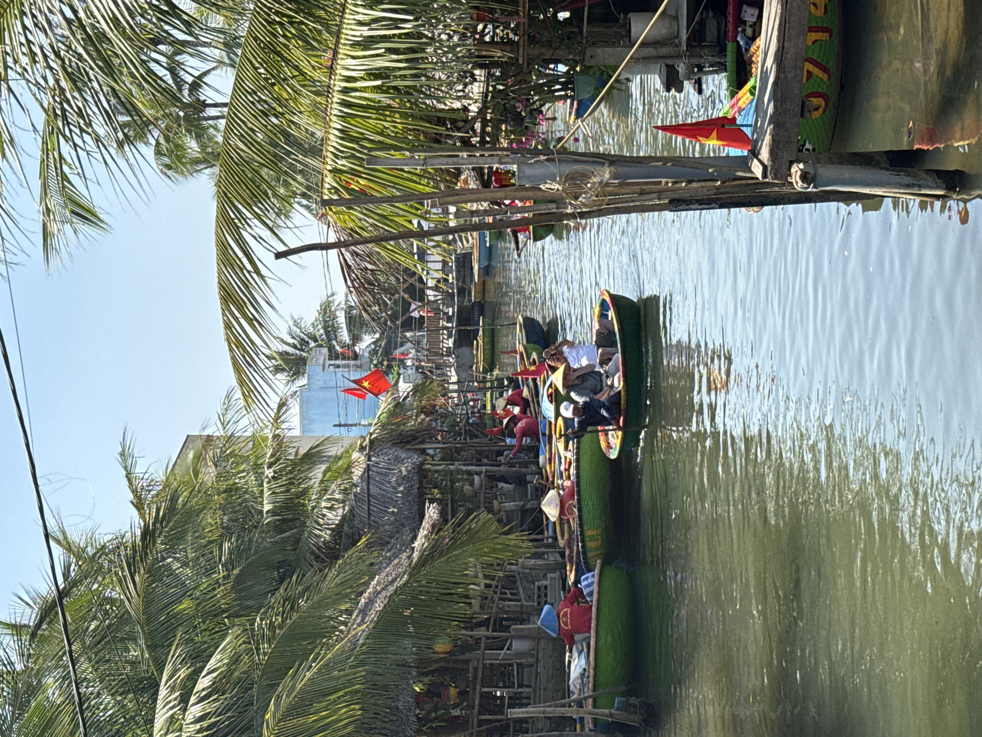 The image depicts a waterway in what appears to be a section of Đà Nẵng, Vietnam, possibly a canal or river branch connected to the city's broader water system. Several boats, traditional in style, are visible. These boats are filled with people and appear to be moored along a wooden structure. Some individuals on the boats are wearing conical hats, a traditional Vietnamese headdress. Red flags, likely Vietnamese national flags, are attached to some of the boats and along the canal side. Lush tropical vegetation, primarily palm trees, lines the bank of the waterway, partially obscuring buildings and structures. The water surface is rippled, reflecting the ambient light and surrounding environment. The scene is bathed in daylight, suggesting it is daytime.
