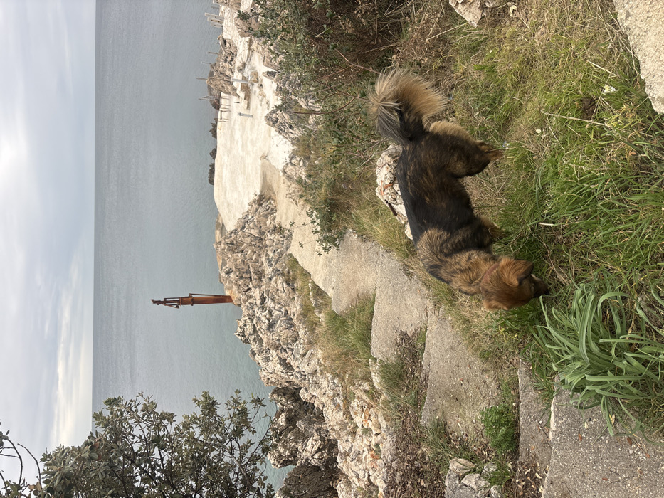 The image depicts a coastal scene in Bar, Montenegro, characterized by a rocky shoreline, concrete infrastructure, and a solitary animal. In the foreground, a medium-sized dog, exhibiting a brindle-like coat with dark brown, black, and tan fur, is positioned on a grassy slope to the right of a descending concrete staircase. The dog's head is lowered towards the ground, indicating it is sniffing the sparse green and dry vegetation. The concrete staircase, partially overgrown with grass and weeds, follows the natural incline of the terrain, leading downwards from the upper left towards a concrete platform at the water's edge. The midground features this light-colored concrete platform, constructed amidst irregular rocky outcrops and sparse Mediterranean vegetation. Several white or light-colored vertical posts, possibly remnants of a railing or dock, are visible on and around the platform. A prominent, heavily rusted, reddish-brown metal structure, resembling a tall, slender mechanical device or a former mooring post, stands vertically on a rocky mound just above the concrete platform, positioned slightly left of center. The surrounding rocks are rough and light in color. The background is dominated by the calm, grayish-blue waters of the sea, extending horizontally to the horizon under an overcast sky with uniform gray cloud cover. A portion of a green-leafed tree is visible in the upper left corner, partially obscuring the distant sea. No human figures are present in the scene.