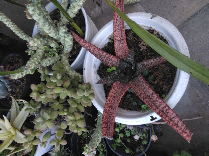 This image depicts an array of potted succulent plants on a gray, possibly paved or tiled surface, consistent with an outdoor or brightly lit patio environment in Venecia, Costa Rica. In the foreground, a white plastic pot prominently features a succulent with five distinct, flattened, reddish-brown leaves displaying darker speckling, radiating from a dark central core. Small green sprouts are visible in the surrounding dark soil. A long, slender green leaf from an adjacent plant partially extends into the lower right of this pot. Behind and to the upper right of this central plant, another white plastic pot contains a light green, bumpy, segmented succulent plant with multiple upward-curving stems. To the upper left, a third white plastic pot holds a cluster of light green, rounded, and possibly fuzzy-leaved succulents. In the upper left background, a fourth white pot contains a variegated succulent with cream and green striped leaves. Additional pots are partially visible: a dark pot in the upper center background with a darker plant, and a dark pot in the lower left background containing a trailing succulent with small, spherical green leaves and tiny white flowers. No individuals are present, and no specific actions or interactions are depicted. The scene is static, showcasing a collection of diverse potted flora.