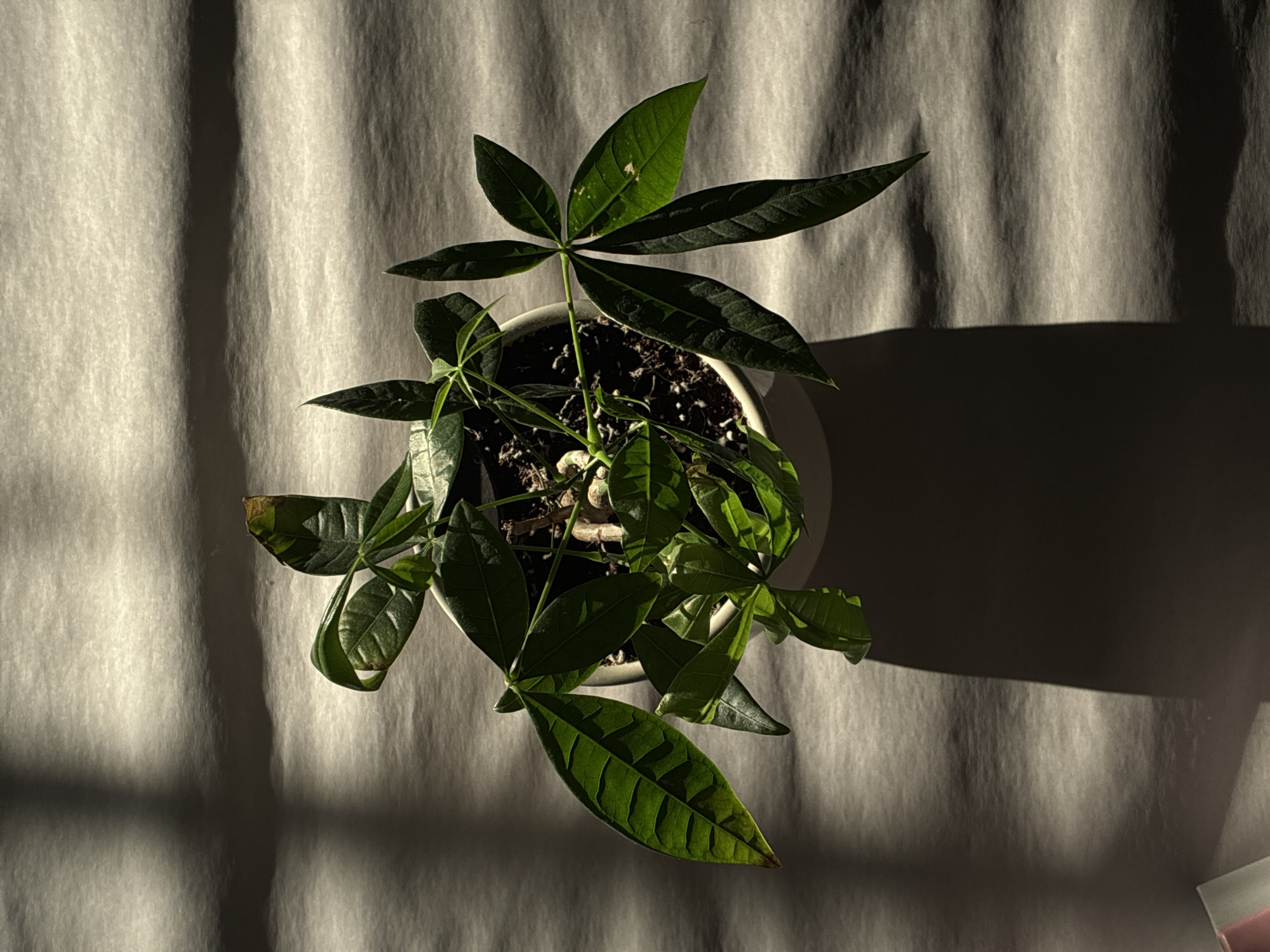 This image depicts an overhead view of a potted plant, located in the city of New York, United States of America. The primary subject is a green, leafy plant, consistent with a Money Tree (Pachira aquatica), contained within a white, round pot. The pot holds dark soil mixed with white perlite-like particles. The plant features multiple stems and palmate leaves, some exhibiting minor browning at the tips or small white spots on their surface. The plant rests on a light-colored, textured surface that displays horizontal undulations, possibly a fabric or wall. Strong, directional natural light illuminates the scene from the upper right, casting sharp shadows. Distinct horizontal striped shadows, indicative of light passing through window blinds or similar slatted structures, are visible across the textured background surface. The plant itself casts a prominent, dark shadow to its lower left. No individuals or other identifiable objects are present in the immediate vicinity.