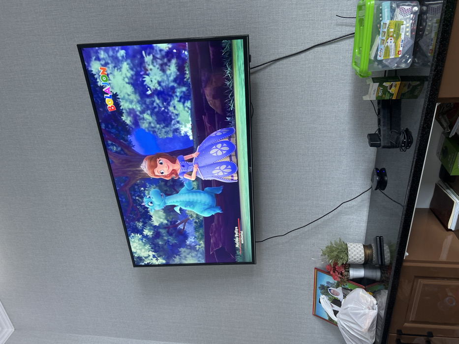 A television displays the cartoon "Sofia the First." Sofia, a young girl in a purple dress, stands next to a blue dragon. The backdrop features a blue-toned forest. The TV is mounted on a light gray wall. A dark-colored shelf to the right holds various items, including a green container, boxes, and books. A framed picture, a small potted plant, and a plastic bag sit below the shelf.