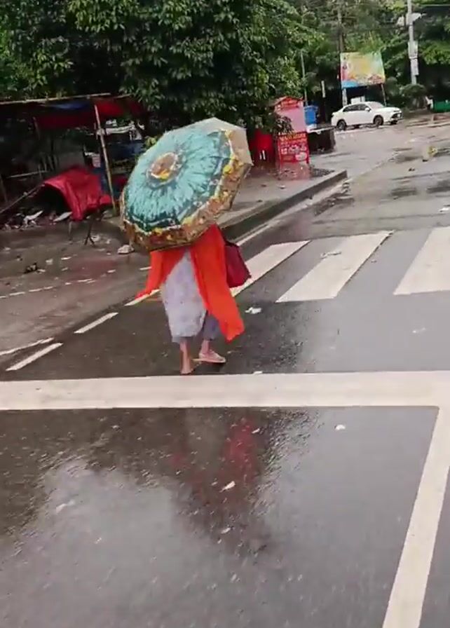 A young woman is walking across a crosswalk in the rain. She is holding an umbrella with a light blue and gold design. She is wearing an orange shawl over a gray floral dress and pink sandals. She is carrying a maroon shoulder bag. The street is wet and there is trash on the ground. There are street vendors and palm trees along the sidewalk. Buildings are visible in the background.