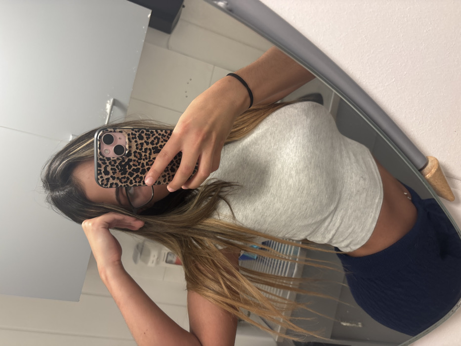 A female individual is depicted taking a mirror selfie in what appears to be an indoor public or commercial restroom. She has long, straight hair with blonde highlights and wears clear-framed glasses. Her left arm is bent, with her hand positioned near her head. Her right hand holds a smartphone, equipped with a leopard print case, angled to capture her reflection. She is dressed in a light grey, short-sleeved crop top, exposing her midriff which features a metallic navel piercing. Dark blue ribbed bottoms are also visible. A black elastic band is on her right wrist. The mirror itself has a dark grey frame along its lower edge and a light wooden support structure is visible beneath it. The reflected background includes white walls, a metallic counter or sink area with a slatted surface, a white wall-mounted dispenser, and light grey wall panels or cabinetry. The specific location within the city of Kehl, Germany, cannot be determined from the visual details presented in the image.