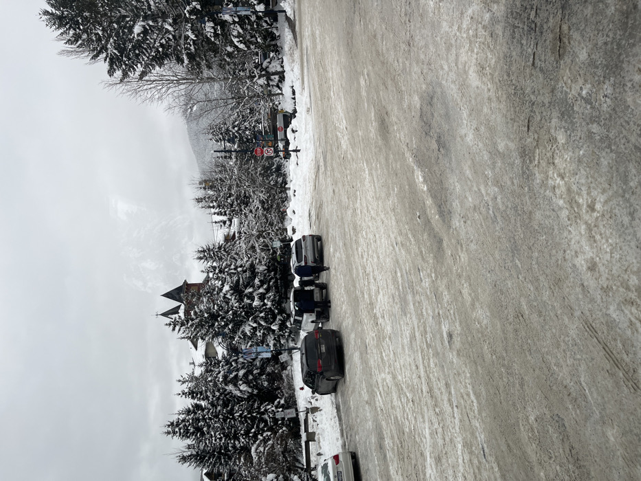A snowy winter scene shows parked cars lined along a street adjacent to snow-laden pine trees. A building with a pointed roof is partially visible amidst the trees. In the distance, a mountain is obscured by a cloudy sky. The street is covered in a layer of snow and slush. A street sign is visible further down the road, close to the first parked car.