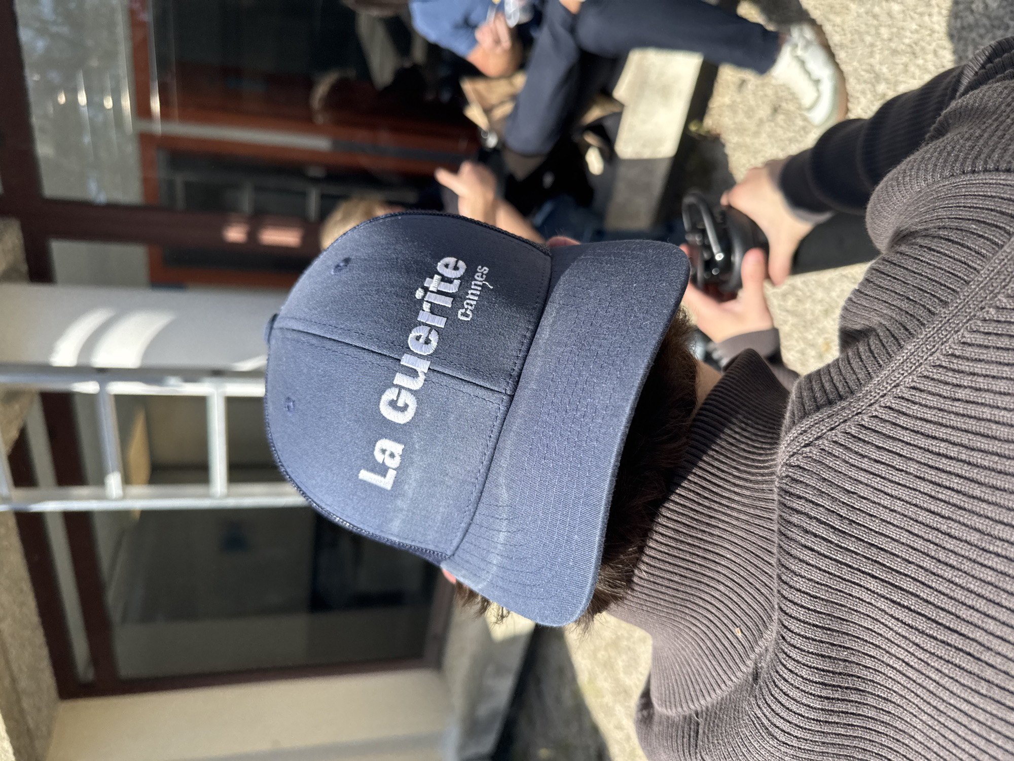 The image depicts an outdoor daytime scene in Valbonne, France, featuring three individuals. In the immediate foreground, seen from behind, is a person wearing a dark blue mesh-back baseball cap with "La Guerite Cannes" printed in white text. This individual also wears a dark brown or grey ribbed turtleneck sweater and holds a black cylindrical object with both hands. Dark hair is visible below the cap. In the midground, to the right and slightly behind the foreground subject, two other individuals are partially visible. One person with blonde hair is seen from behind, wearing a blue shirt. Further to the right, another individual is seated, wearing a blue short-sleeved shirt, dark blue trousers, and white sneakers with light green soles, holding a small container, appearing to be eating. A light brown bag rests near this seated individual. The background consists of a light-colored building with prominent dark brown or reddish-brown door/window frames. Through an open doorway or window on the left, a metallic stepladder is visible. The ground surface is paved, likely concrete or gravel, and is illuminated by bright sunlight, casting distinct shadows.