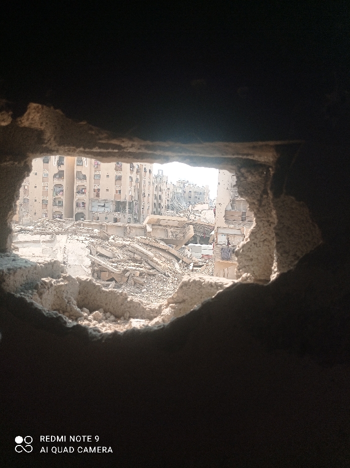 - "The image presents a scene of extensive urban destruction in Khan Yunis, Palestinian Territory, viewed through an irregularly shaped, rough-edged opening in a dark, interior structure" by FM-iymI62, licensed under CC BY 4.0