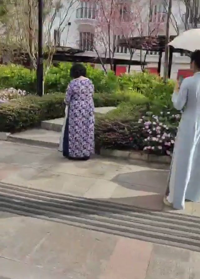 Two women walk along a patterned stone sidewalk next to a road. One woman wears a long, light-blue dress and carries a white umbrella. The other woman wears a long, purple floral-patterned dress. A blue and white plaid umbrella lies on the ground. The sidewalk is bordered by a garden filled with colorful flowers. Buildings are visible in the background. A car passes by on the road. The sky is overcast.