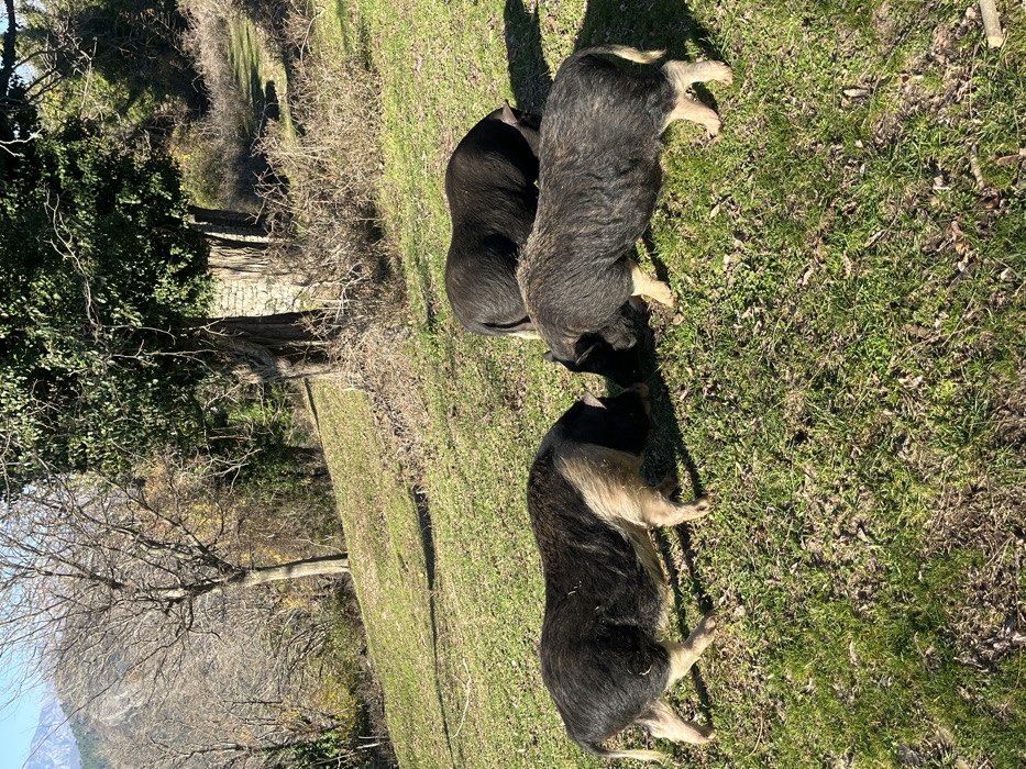 In Škaljari, Montenegro, a sloped, grassy field is illuminated by direct sunlight, casting distinct shadows. Three pigs are positioned in the foreground and midground. One pig on the left is predominantly black with tan lower body, snout, and legs, facing right with its snout near the ground. Adjacent to it, another pig, primarily black with lighter lower legs, faces left, its snout also near the ground. A third, mostly black pig is partially obscured in the midground behind the second, similarly rooting in the grass. The environment features green grass interspersed with dry patches. The background consists of an upward-sloping landscape with several trees; two large trees on the right are heavily covered in green ivy, while bare deciduous trees are visible further left. A mountain range is discernible in the far background on the left under a clear blue sky.