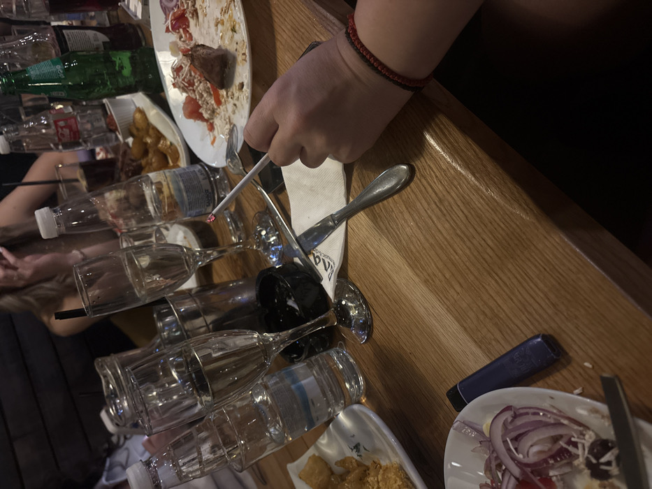 The scene depicts an indoor dining area at a Raos restaurant in Sofia, Bulgaria, characterized by a light-colored wooden table and a dark, indistinct background. Numerous items are arranged on the table, indicating a social meal. In the immediate foreground, a right arm is visible, adorned with two braided bracelets (one black, one red), holding a lit cigarette with a visible glowing ember. To the left, a white ceramic plate contains remnants of a salad, including sliced red onions, crumbled white cheese, and dark olives. A purple disposable vape pen lies beside this plate. Further left, a small white plate holds fried items, possibly french fries or nuggets. Central to the image, several glasses and bottles are present. Two champagne flutes, one partially filled with a clear liquid, and another clear glass containing water are visible. A transparent plastic bottle of Sandor mineral water stands upright. A metal ice bucket or container is also on the table. A white napkin with the "Raos" logo is positioned under a silver knife and fork. Adjacent to the cutlery, a black ashtray is visible. Towards the right, another white plate holds remnants of food, including a piece of meat and a salad with chopped tomatoes and a grain-like base. Various beverage bottles and glasses are clustered in the background, including a green glass bottle, a red-labeled bottle, and a dark beverage in a glass with a black straw. In the blurred background, several individuals are present. One person with light-colored hair, wearing a strapless garment, is visible gesturing with their hand near their face. Other figures are indistinct, suggesting multiple diners or patrons in the dimly lit environment. The overall scene indicates an ongoing meal with drinks and smoking.