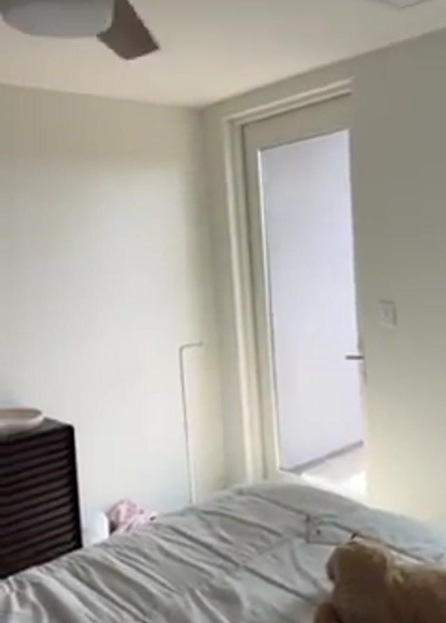 The video begins with a baby lying on a bed next to a stuffed bear. The baby is wearing white pajamas with a small print. The bed has a gray cover on it, and there are throw pillows at the edge of the bed. The camera then pans upward to the ceiling, showing a ceiling fan with dark wooden blades and a white light fixture in the center. The ceiling and walls are white. There is a white door in the background.