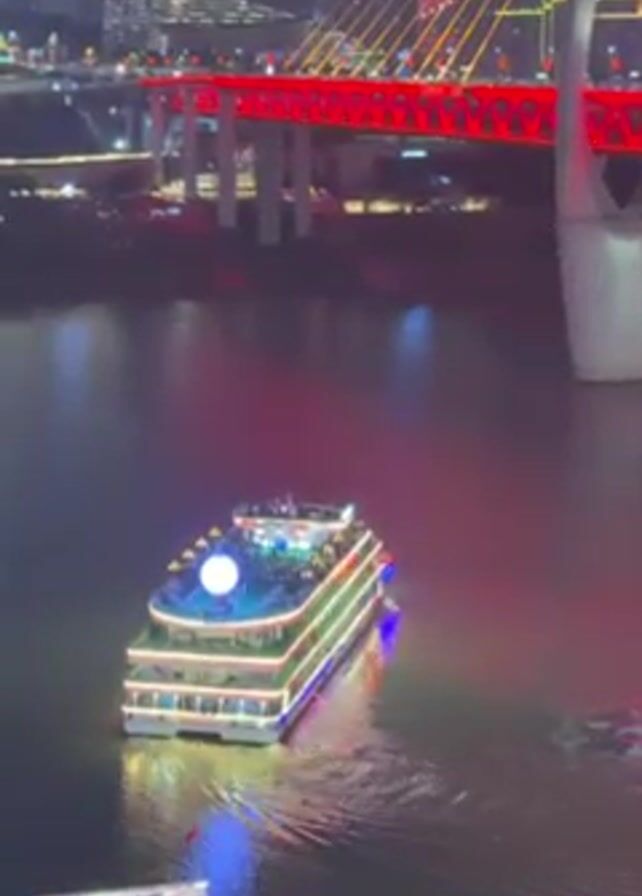 brightly lit, multi-decked boat sailing on a river at night. The boat is decorated with colorful LED lights. A large, illuminated red bridge is visible in the background, along with city lights. Another smaller boat is docked nearby. The water reflects the lights from the boats and the city. The scene appears to be in a city with modern architecture.