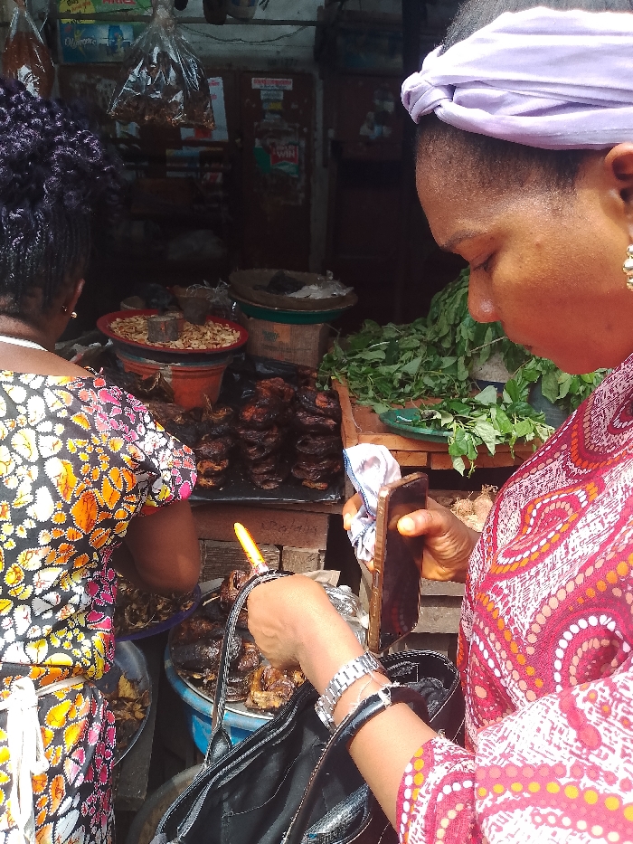 In a market setting in Mgbuoshimini, Nigeria, two women interact with a vendor stall. In the right foreground, a woman with dark skin is seen in profile, facing left and looking downward. She wears a light purple headwrap, a red and white patterned top, and a gold hoop earring on her right ear. Her right hand holds a dark-colored smartphone, partially obscured by a white cloth. Her left arm, featuring a silver-colored wristwatch, is visible above a black handbag. In the left background, a second woman is positioned with her back to the camera, wearing a multi-colored top with orange, yellow, and black patterns; her dark hair is styled in braids. The market stall displays various goods. Numerous pieces of dark brown, smoked or dried fish are stacked on black trays on a counter. To the left of the fish, a red bowl holds light-colored grains or nuts. A pile of green leafy vegetables is visible on a tray to the right. Overhead, several clear plastic bags containing dried food items hang. A metal weighing scale is present on the counter in the background. The background wall appears dark and worn, with indistinct signage.