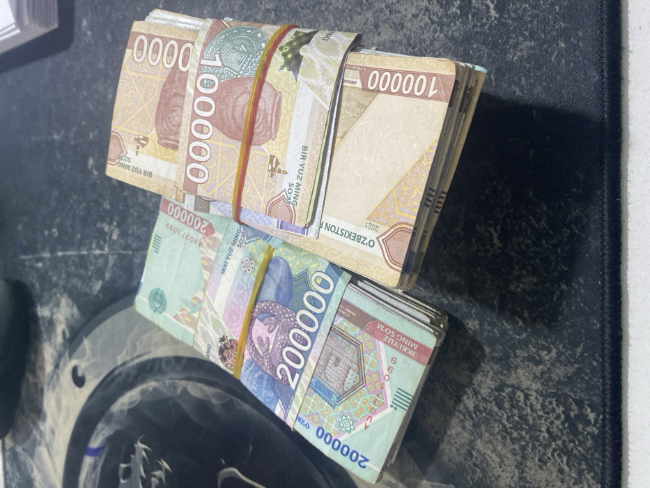 - "The image presents two distinct stacks of Uzbekistani Som banknotes resting on a dark, textured desk mat" by FM-SShF13, licensed under CC BY 4.0