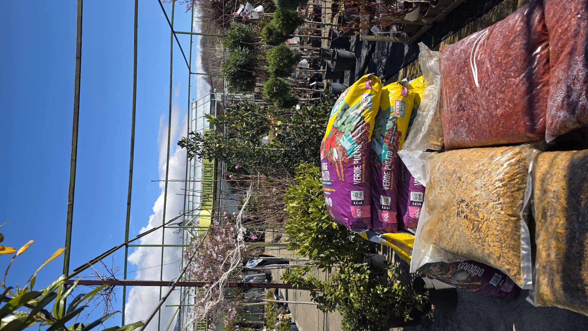 interior of a garden center, likely located in or near Usoika, Bulgaria, as the inscription "ГРАДИНСКИ" (Gardening in Bulgarian) is visible. Bags of soil or mulch are stacked prominently in the foreground, with labels like "VERDE PULITO" and "DECORAL" visible. The bags come in different colors such as red, yellow, brown, and purple. Plants, including shrubs and trees in pots, are visible in the background. Structural elements of what appears to be a greenhouse or covered area are also present, with metal beams framing a view of the blue sky and some clouds.