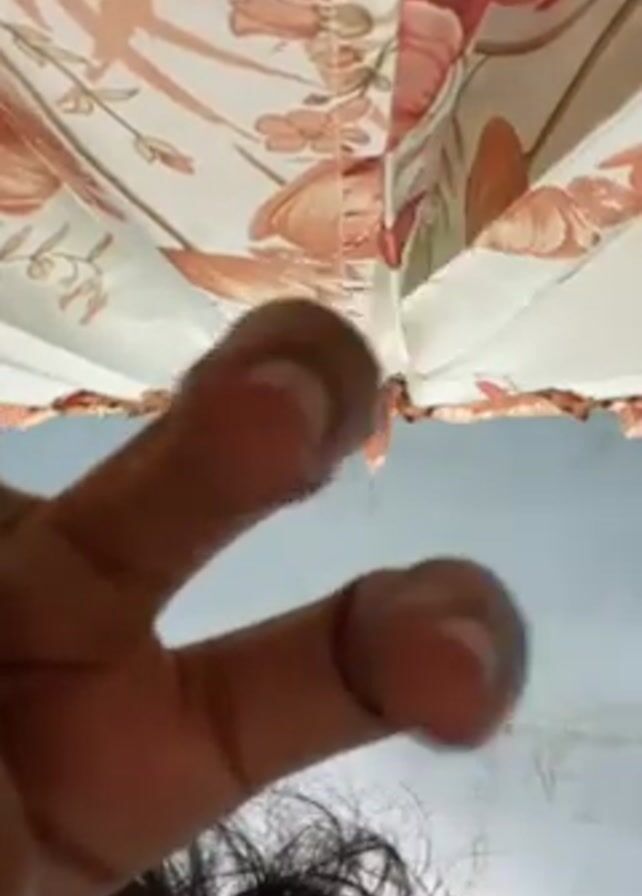 The video is filmed from a low-angle perspective, showing a person's hand making a peace sign in front of a floral-patterned curtain