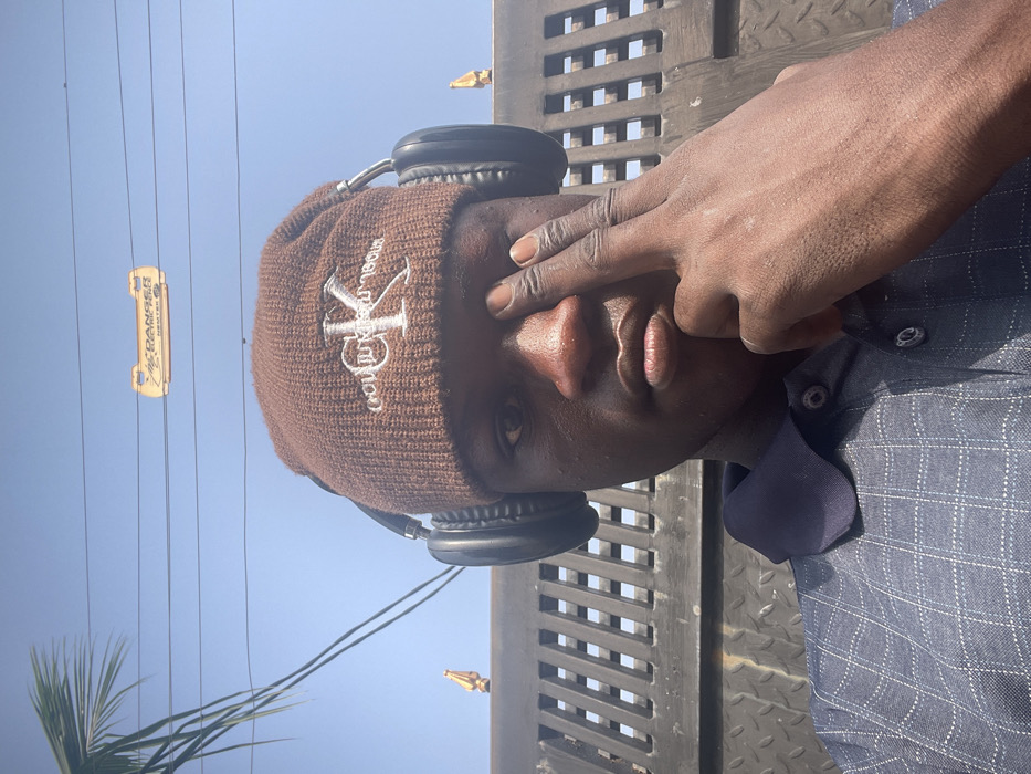 A medium close-up shot captures a young Black male against an outdoor backdrop in Langbasa, Nigeria, under a clear blue sky