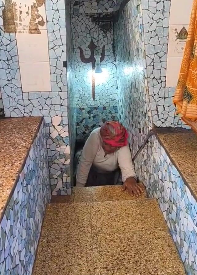 A woman with a red headscarf is seen descending a narrow staircase. She is wearing a white shirt and using her hands for support as she navigates the steps. The staircase is flanked by tiled walls with a mosaic pattern in shades of blue and white. On one wall, a trident symbol is visible above a light fixture. The lighting is moderate, and the space appears to be enclosed. There is a patterned cloth draped on the right side of the frame.
