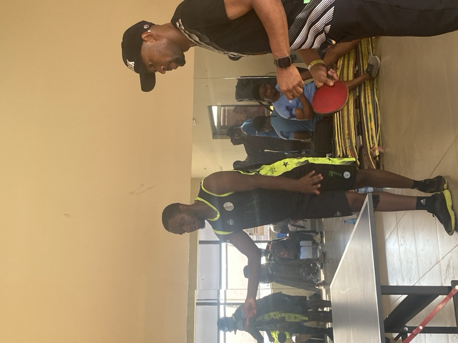 This image depicts an indoor scene, likely a recreation or practice area, in Unguwar Sarki, Nigeria. In the immediate foreground, a dark-colored ping-pong table with a white net is partially visible on the left. Two adult males are prominent in the mid-ground. On the left, a man with dark skin, a short beard, and a short haircut is standing. He wears a black sleeveless athletic top with green-yellow accents and white logos, and black athletic shorts with similar green-yellow star motifs on the sides. He also wears black athletic shoes with yellow soles. His left arm is extended forward at chest height, with his hand open and fingers slightly spread, as if indicating a direction or motion. To his right, another adult male with dark skin and a short beard is positioned in profile, facing right. He wears a black baseball cap with white lettering, a black short-sleeved athletic shirt with white diagonal stripes on the shoulders and torso, and black athletic shorts. A black smartwatch is visible on his left wrist, and he holds a red ping-pong paddle in his right hand, oriented downwards. The background features light-colored walls and large mirrors reflecting parts of the room, including other individuals. Through a window on the left, bright natural light is evident. Several other people, mostly men, are visible in the background, some seated, some standing, some obscured by reflections. One individual in the far right background is seated on a stack of flat, possibly cardboard or wooden, rectangular items. A blue water bottle is on the floor near the ping-pong table. The flooring appears to be a smooth, light-colored surface. The overall lighting is bright and even.