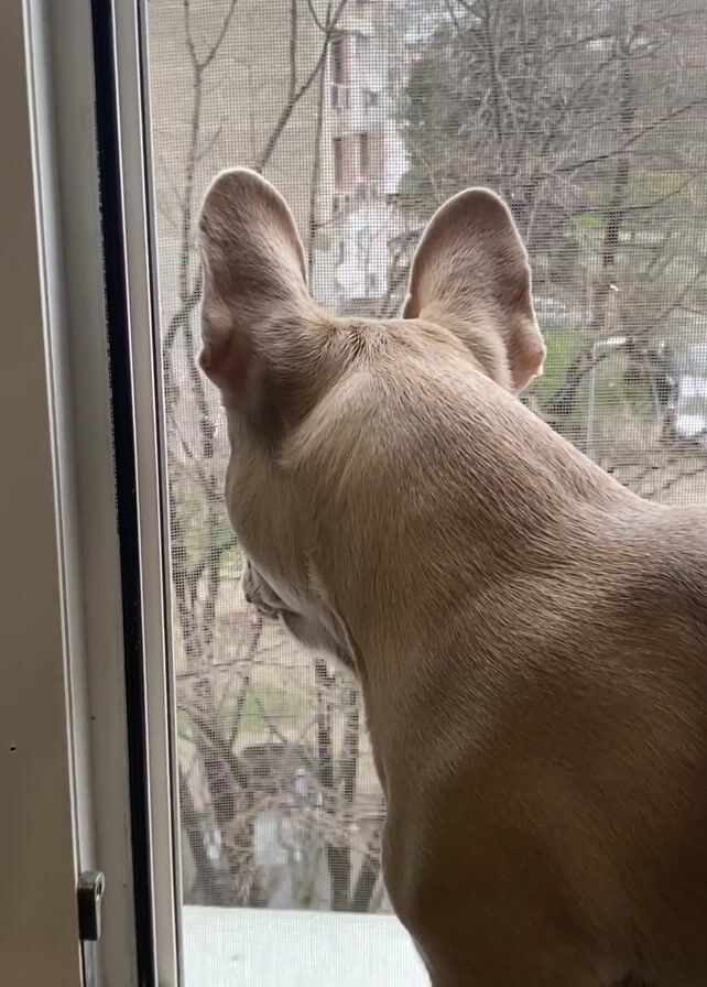 A light-brown French Bulldog is standing on a window sill looking out of a window. The dog’s back is to the camera initially. The dog turns its head to look at the camera with a concerned expression before turning away again. The window has a screen on it and a partially visible building can be seen outside. The weather is overcast.