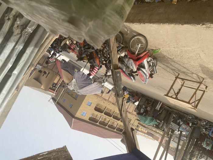 The image depicts an outdoor street scene in Sabon Gari West, Nigeria, captured under bright daylight