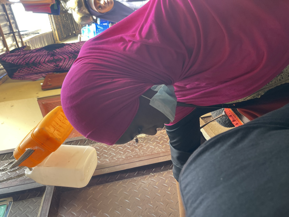 This image, taken in a market in Samaru, Nigeria, features a young individual in the foreground, presented in profile facing left and looking downwards. This individual wears a bright pink hijab, a black long-sleeved garment, and a light blue surgical mask pulled down below the nose. To the immediate left, a brown metallic surface with a diamond plate pattern is visible, from which a translucent white plastic jerrycan and an orange plastic container are suspended by cords. In the background, partially obscured, another individual in a dark blue head covering with an item on their head is visible. Above, various garments, including a purple and black tie-dye fabric, hang from a structure beneath a corrugated metal roof, indicating an outdoor or semi-enclosed market stall setting. Blue containers are also present in the background.