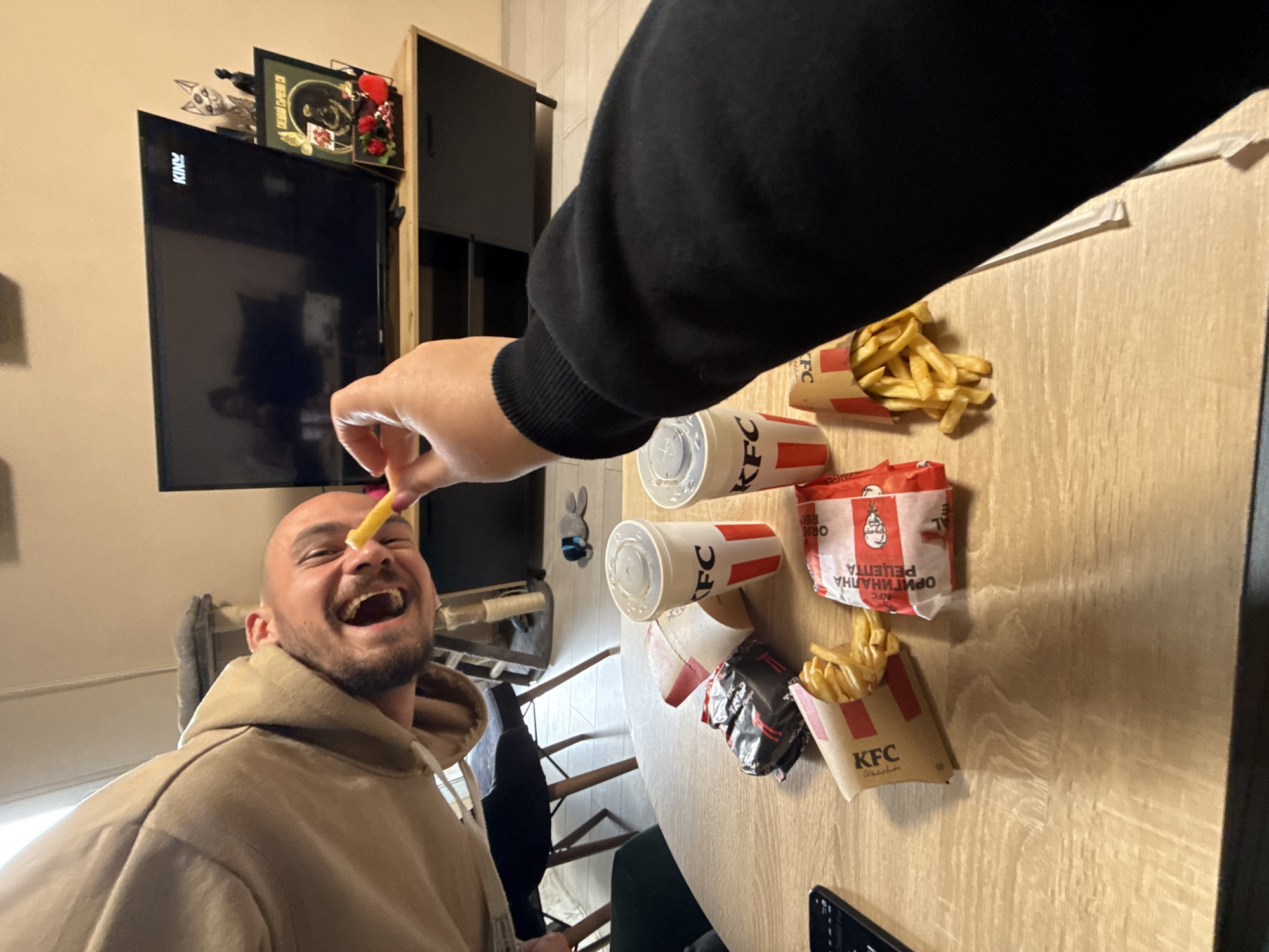 An indoor scene in a residential setting in Sofia, Bulgaria, depicts an interaction between two individuals centered around fast food. In the foreground, a light wood-grain table holds an assortment of KFC items: two white paper cups with red KFC branding and clear dome lids, two open cardboard containers filled with french fries, and a red and white wrapper with "ОРИГИНАЛНА РЕЦЕПТА" (Original Recipe) printed in Bulgarian Cyrillic. A dark-sleeved forearm and hand, belonging to an unseen individual, extends from the right, holding a single french fry towards a male subject on the left. This male subject, bald with a beard, is leaning into the frame from the left, wearing a beige hooded sweatshirt, with his mouth open in an expression of laughter or anticipation, receiving the fry. The background reveals a domestic environment. A dark television screen displaying faint white text, possibly "KINZI," rests on a two-toned wooden media console with dark drawers. To the right of the television, decorative items include a framed object with "САБАЙН СУПЕР ГРЕН" in Cyrillic, a stylized white cat figurine, and a small dark sculpture. Partially visible behind the male subject are elements of another room or corner: a dark chair with wooden legs, and a multi-tiered cat tree. The walls are a light, neutral color, and the floor is a pale tile or laminate.