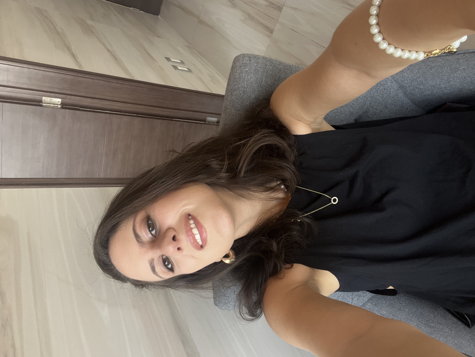 A woman with dark brown hair and light skin sits in a grey chair. She wears a black blouse and a gold necklace with a circular pendant. A gold hoop earring is visible on her left ear. She is smiling, facing the camera. Her right arm rests on the chair. A pearl bracelet adorns her wrist. A door and light switches are in the background against a wall with marble-like tiling.