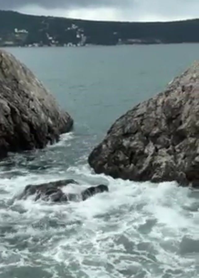 The video depicts a rocky coastline on an overcast day. The water is choppy and white waves crash against the dark gray rocks. A view through a narrow gap between two large rocks shows a distant coastline with buildings visible. The camera pans slightly to the right, focusing on the waves hitting the rocks. The sky is gray and cloudy.
