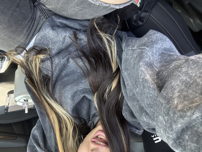 A close-up, high-angle shot depicts an individual seated in the interior of a vehicle in Plovdiv, Bulgaria. The subject, visible from the chest to the upper thighs, has long, dark brown hair with prominent blonde highlights and is wearing a grey, acid-wash or stone-washed hooded sweatshirt with a front pouch pocket. A white undershirt is visible beneath the hoodie. The individual's lower face is partially visible, with lips parted and the tongue slightly extended. A small, silver-colored earring or piercing is present on the visible left earlobe. Dark grey or black jeans are worn on the lower body, with part of a black shoe or boot featuring white stitching and a thick sole visible on the lower left. To the subject's right, a white insulated travel mug with a straw is positioned in a cup holder, with a dark electronic tablet partially visible behind it. The vehicle's interior features a dark seat, a headrest with an inverted white logo, and a dark dashboard or door panel with metallic trim. The scene is brightly illuminated, indicating daylight.
