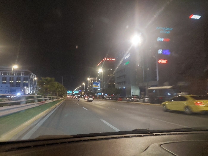 - "The image displays a nocturnal scene captured from within a vehicle, looking forward through its windshield, on a major thoroughfare in Paleo Faliro, Greece" by FM-b94Yk2, licensed under CC BY 4.0