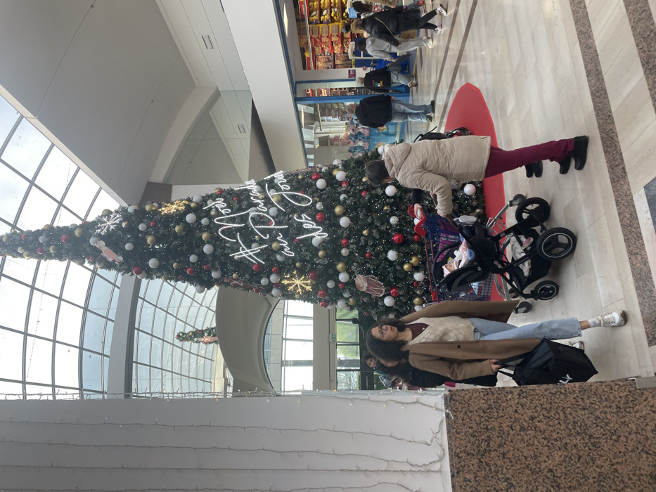 This image depicts an indoor scene within a commercial center in Mondeville, France, extensively decorated for Christmas