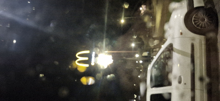 The image depicts a nighttime urban scene in Mirandela, Portugal, observed through a surface with refractive artifacts, possibly a wet or smudged window. The primary subject is a white passenger vehicle, partially visible in the lower half of the frame, facing right. It exhibits a dark horizontal trim strip along its lower side and a lighter, vertical strip on its front door. In the mid-ground, a prominent, illuminated yellow "M" logo of a McDonald's establishment is visible on a tall pole. Below the "M" logo, another section of the sign is illuminated but indistinct due to glare. The background consists of a dark sky illuminated by various bokeh effects from distant light sources and several discernible streetlights on poles along what appears to be a roadway or parking lot. No individuals are clearly identifiable.