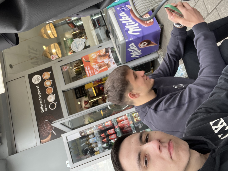 Two young adult males are seated outdoors, positioned in front of a storefront establishment in Plovdiv, Bulgaria
