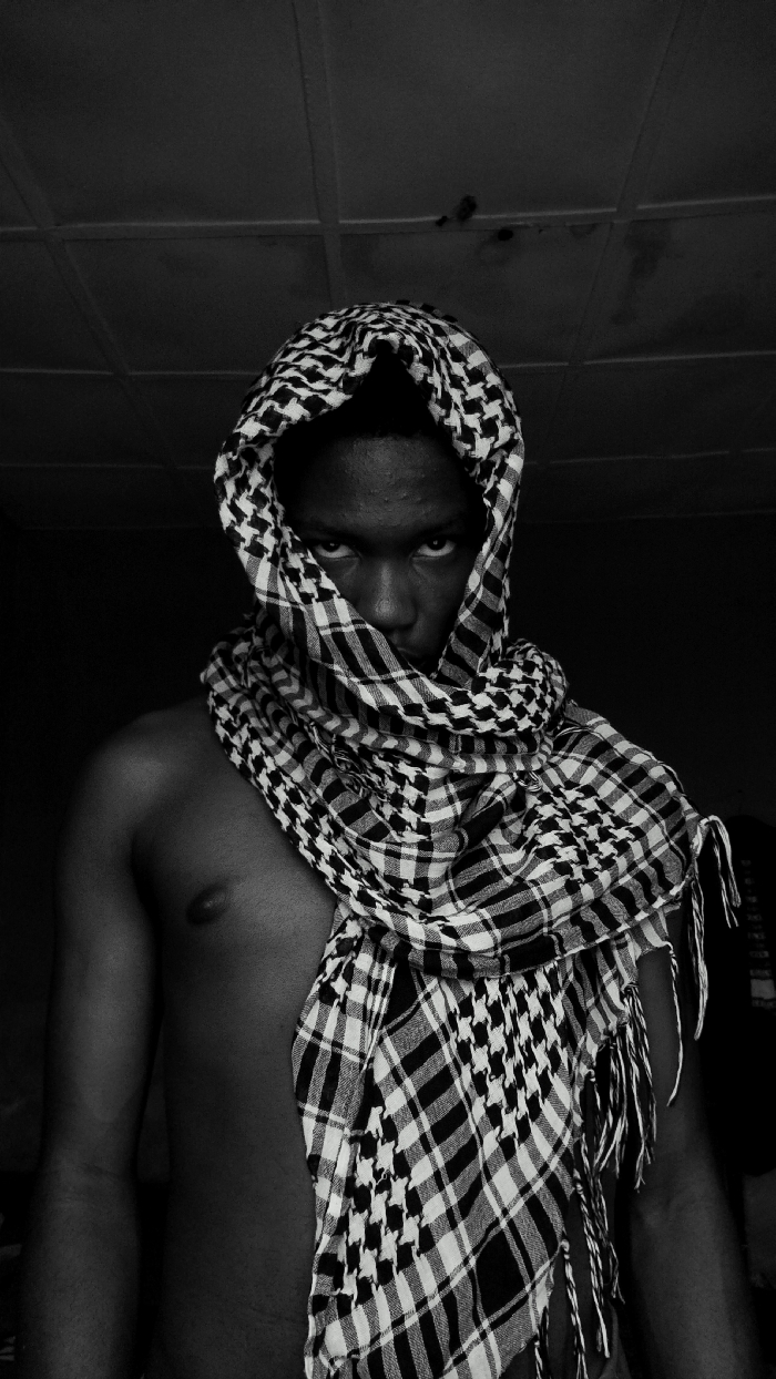 A black and white, close-up, frontal portrait depicts an individual, presumably male, with dark skin, situated indoors in Keffi, Nigeria. The subject's upper body is bare, revealing the right shoulder and a portion of the chest. The individual is enveloped in a black and white checkered keffiyeh (shemagh), which covers the head, neck, and lower face, leaving only the eyes and a segment of the forehead and nose visible. The eyes are open and directed forward, appearing illuminated within the heavily shadowed face. The keffiyeh displays distinct houndstooth and checkered patterns, with visible fringes on the right side. The background is predominantly dark, with a ceiling visible at the top of the frame featuring linear seams and two small, indistinct dark anomalies. The lighting emphasizes the subject's visible facial features and the texture of the keffiyeh, casting much of the scene into shadow.