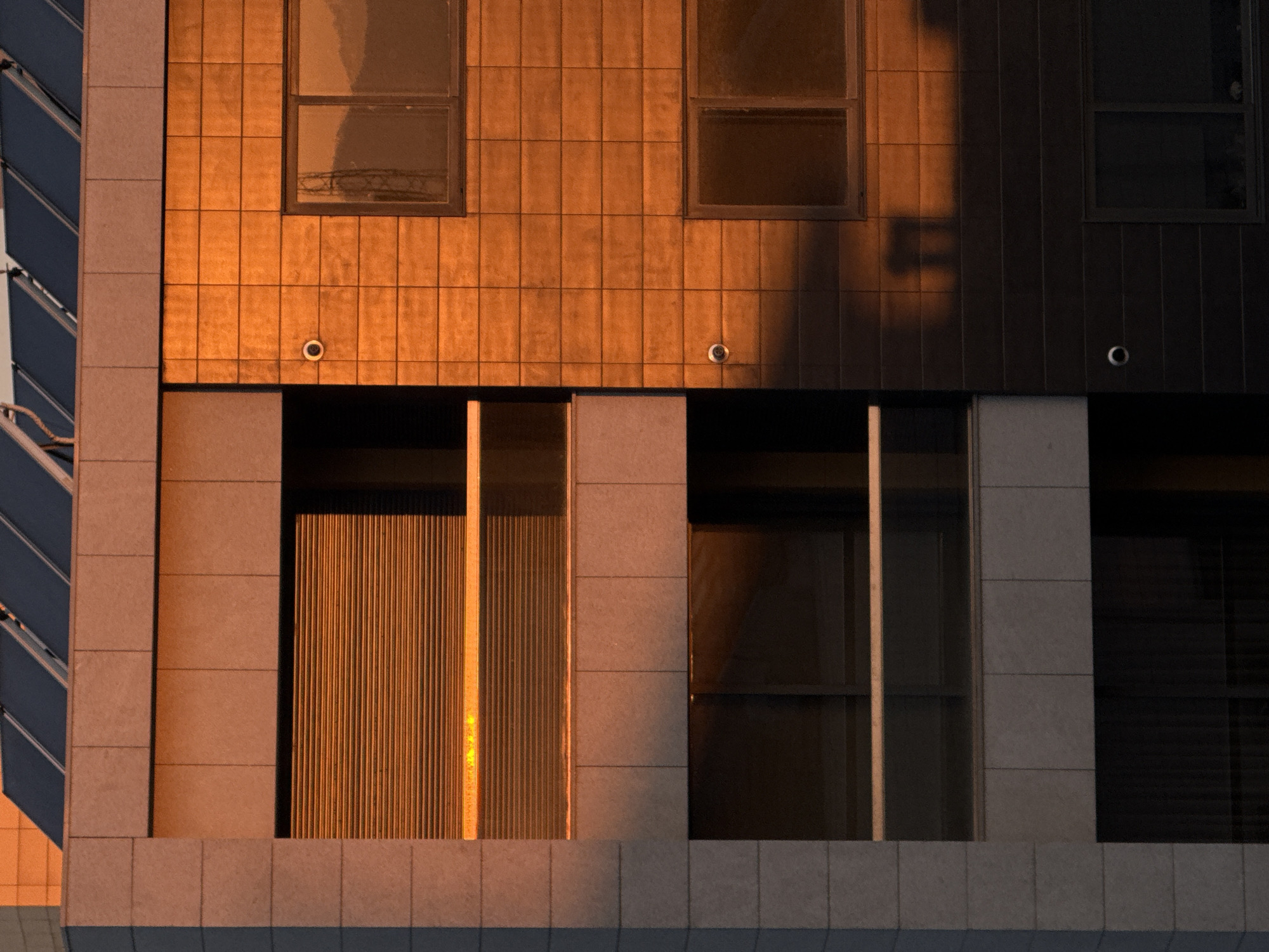 This image captures a vertical section of a modern building facade in Vila Nova de Gaia, Portugal, bathed in warm, low-angle sunlight, indicative of either sunrise or sunset. The building exhibits a bifurcated architectural design. The left segment features light grey, possibly concrete, paneling, constructing a prominent vertical structural element and horizontal balcony ledges. An upper-level recessed area within this segment contains a wide, horizontal roller shutter, which is intensely illuminated in an orange hue. Below this, a subsequent recessed balcony level is partially visible, equipped with a clear glass railing. The right segment of the facade is surfaced with rectangular, orange-brown tiles, displaying a distinct texture. This tiled section transitions downward into a darker grey or black textured material. Two circular security cameras are affixed to the facade: one centered on the upper orange-tiled section and another positioned lower on the dark textured material. Multiple dark-framed windows are present on the tiled portions; the upper window on the right segment reflects a distant landscape, including what appears to be a power transmission tower and undulating terrain. Above the building's upper edge, several angled solar thermal or photovoltaic panels are visible on the roofline. Pronounced, elongated shadows, originating from unseen architectural elements, are cast diagonally across the lower, darker section of the facade. No human figures are present in the scene.