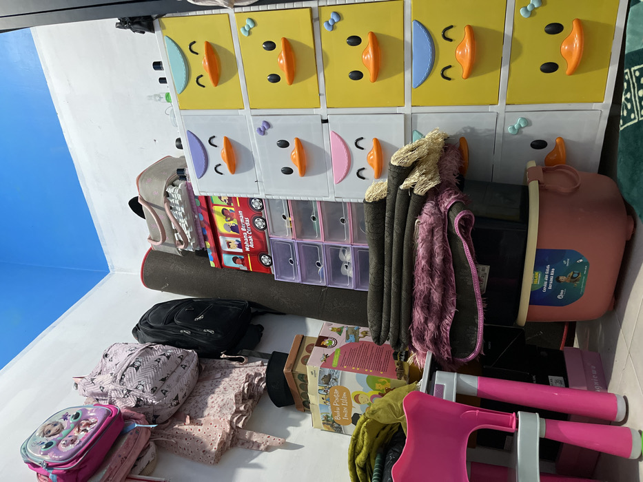 An indoor scene in a room located in Gampongjawa, Indonesia, depicts a corner filled with various domestic items, primarily children's belongings and storage solutions