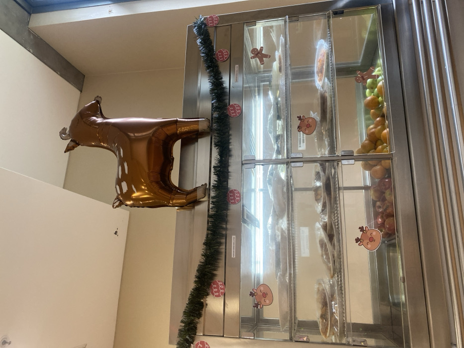 A brown deer balloon, adorned with white spots, hovers near a stainless steel cabinet. The cabinet's facade is decorated with a green garland featuring red ornaments. Inside, clear compartments display an assortment of items, including fruit, pastries, and gingerbread men stickers. A series of Rudolph stickers are also visible on the glass. The composition is presented from a slightly tilted perspective.