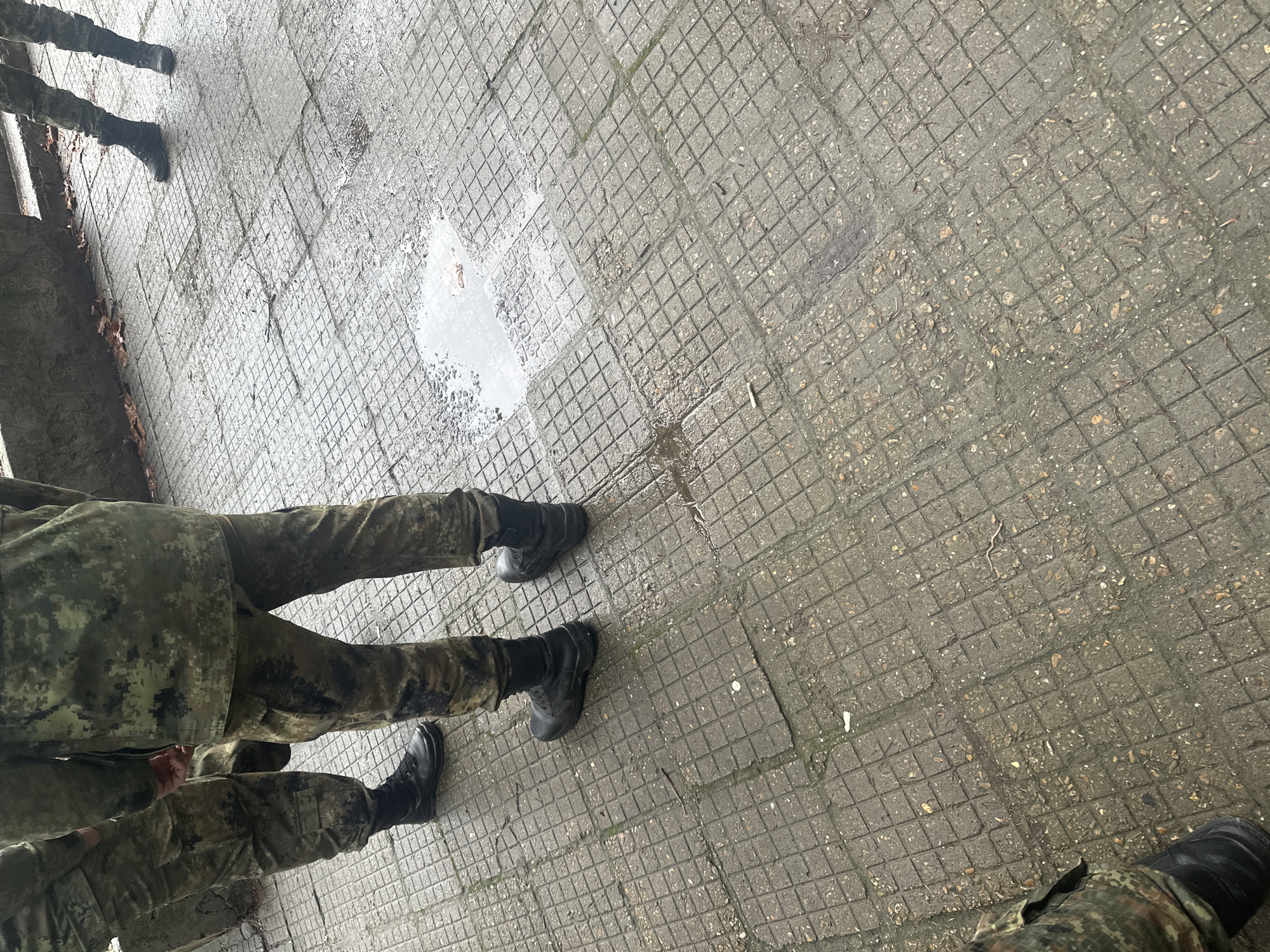 ground-level view of a concrete tile surface, possibly a sidewalk or a paved area. There are puddles of water on the tiles, indicating recent rain or wet conditions. The legs and feet of several individuals wearing camouflage trousers and black boots are visible in the image. These individuals appear to be standing on the paved surface. The tiles are gray and appear to be textured. The location might be Veliko Tarnovo, Bulgaria.
