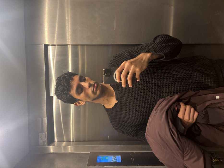 - "A young adult male, of apparent Middle Eastern or South Asian descent, with dark curly hair and light brown skin, is depicted in a mirror selfie taken inside a brushed stainless steel elevator" by FM-98Chk1, licensed under CC BY 4.0
