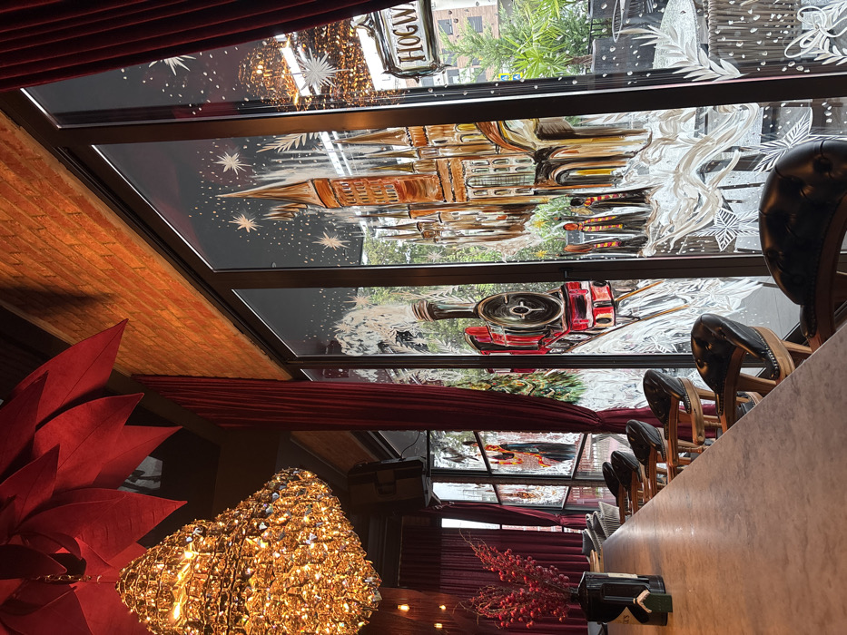 This image depicts the interior of a themed establishment located in Ulcinj - Ulqin, Montenegro. The scene is dominated by a long, light-colored bar counter extending from the lower-left foreground, furnished with multiple dark leather-backed bar stools. On the bar, a black vase containing red decorative branches or berries is present, alongside a small green house-shaped ornament. Overhead on the left, a large, ornate, gold-toned crystal chandelier hangs, complemented by red, leaf-like ceiling decorations. An exposed brick wall section is visible above the windows, which are framed by dark red velvet curtains on both sides. The prominent feature is a series of floor-to-ceiling windows across the right side of the image, divided by dark frames. These windows are intricately painted with a winter-themed "Harry Potter" motif. From left to right on the painted windows, a red steam locomotive, suggestive of the Hogwarts Express, is depicted amidst a snowy landscape with evergreen trees. Further right, a multi-towered castle, reminiscent of Hogwarts, stands against a dark sky filled with painted stars. Below the castle, several small figures in robes and striped scarves are shown. The lower portions of the windows feature painted snow and icy patterns. Through or on the rightmost window, a "HOGWARTS" sign, hanging by chains, is partially visible. Beyond the windows, an outdoor patio area with dark tables and chairs is discernible, surrounded by green foliage. No actual people are present in the depicted scene.