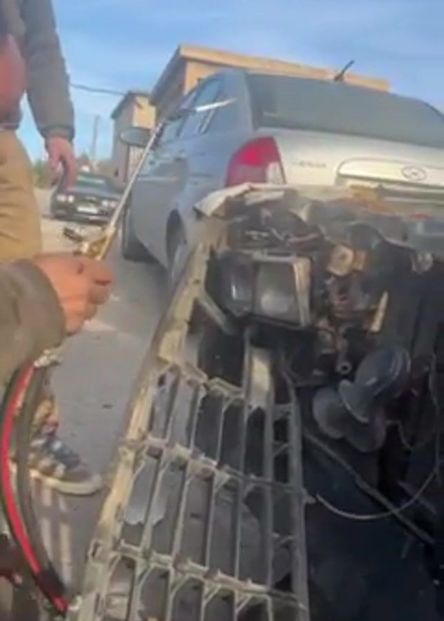 two men working on the front of a damaged car. One man is using a torch to heat something on the car's front end, where the grill is removed exposing the radiator and other parts. The grill is also leaning in front of the car. The second man is standing behind him observing the first man. The car is in poor condition with visible rust and damage. Another car, silver, is parked behind it. The setting appears to be an outdoor area, possibly a street or repair shop. The weather is sunny.