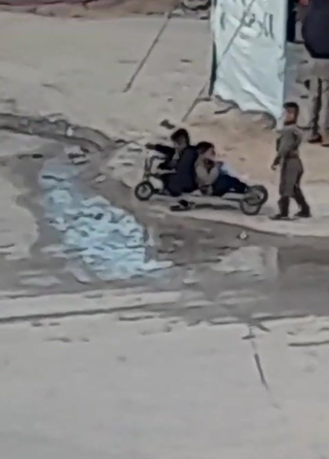 three children playing outdoors. Two of the children are sitting on a three-wheeled scooter-like contraption. A third child is standing next to the scooter. A man stands next to a tent in the background. The ground is sandy and uneven. There is a small stream of water on the ground. The quality of the video is poor, and the subjects are somewhat blurry.