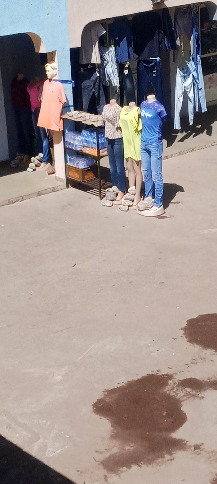This image depicts an outdoor retail display situated in Sabon Tasha, Nigeria. The scene is illuminated by direct sunlight, casting distinct shadows. On the left, a light blue building facade features two arched openings. Within the left archway, a headless, dark-skinned mannequin torso wearing a dark red top and blue jeans is partially visible. Adjacent to it, a headless, light-skinned female mannequin torso displays a pink top and blue jeans. Further to the right, positioned against the building, stands a light-skinned male mannequin with blonde hair, wearing an orange polo shirt and blue jeans. This mannequin rests on a circular light-colored base, with multiple irregularly shaped grey stones placed around its feet for stability. A two-tiered metal display stand is positioned to the right of the male mannequin. The top shelf holds an arrangement of numerous small, irregularly shaped grey stones. The bottom shelf contains multiple clear plastic bottles of water, some organized within a brown wooden crate that partially displays the label "GUINNESS." To the right of the display stand, three additional headless, light-skinned female mannequin torsos are arranged. From left to right: one wears a floral patterned blouse and blue jeans; the next wears a bright yellow sleeveless top or dress and blue jeans; and the last wears a blue short-sleeved t-shirt with a white "Pfizer" logo and distressed blue jeans. Each of these mannequins' feet are surrounded by multiple irregularly shaped grey stones, serving as supports. Some mannequins are observed wearing flat, light-colored shoes. Behind these central mannequins, various items of clothing, including shirts and jeans, hang from dark-colored racks suspended from an unseen overhead structure or awning. The ground surface in the foreground and beneath the display is a light grey concrete or paved material. In the lower right quadrant of the image, a large, irregular dark brown stain or discoloration is present on the paved surface. Strong shadows are cast from the mannequins and the building elements towards the foreground.