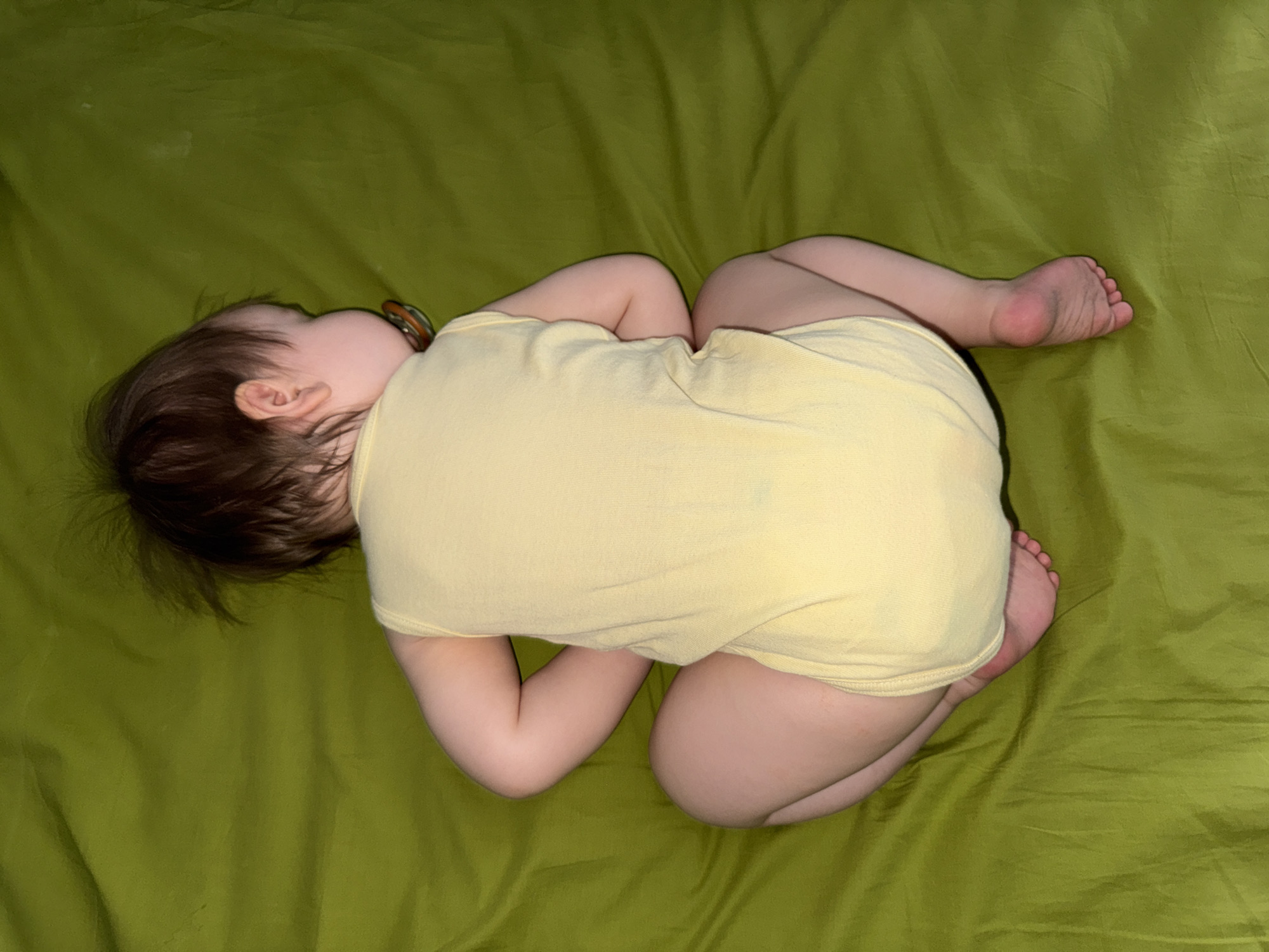 - "A baby sleeps curled on a green sheet, wearing a yellow onesie" by FM-QS3wf1, licensed under CC BY 4.0