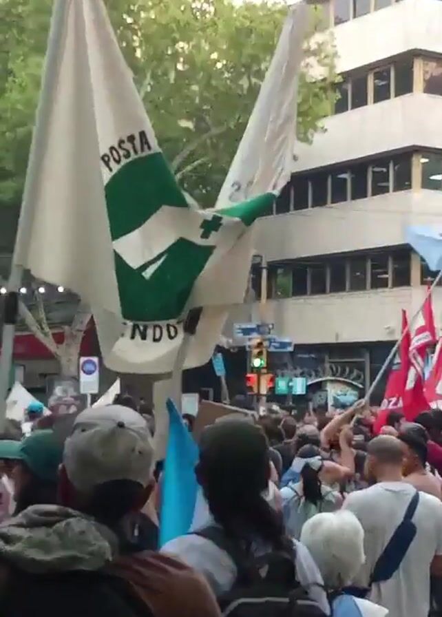 crowd of people marching down a street in what appears to be a political rally or demonstration. The perspective is from within the crowd, focusing on the backs of people in front of the camera. The crowd is diverse in age and appearance, with many holding flags and banners. Prominent flags include Argentinian flags and those with a green cross on a white background, some of which read "POSTA MENDOZA." The environment includes buildings in the background, a Christmas tree decorated with red and gold ornaments on the right side of the frame, and a street with traffic lights. The overall impression is of an active and engaged crowd participating in a public event.