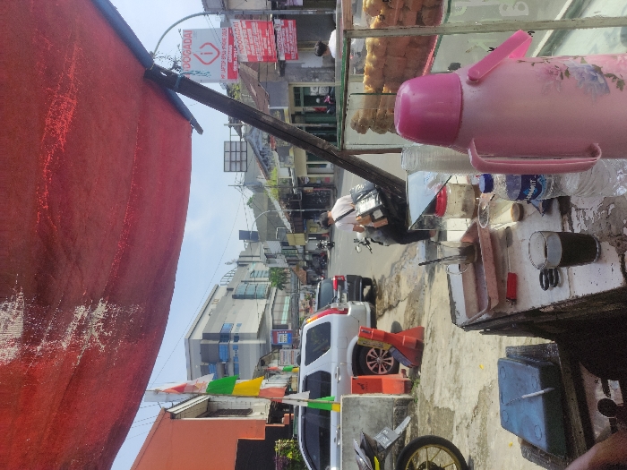 - "The image displays a sunlit urban street scene in Bogor, Indonesia, observed from under a weathered red canvas tarp, likely an awning for a roadside vendor" by FM-Vgzck1, licensed under CC BY 4.0